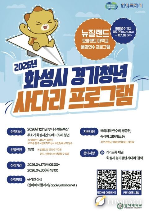 루미팩트 백라희 기자 | 화성특례시는 해외 연수를 희망하는 청년들에게 경제적 부담 없이 글로벌 경험을 쌓을 수 있는 ‘화성시 경기청년 사다리 프로그램’(운영기관: 평택대학교 산학협력단) 2기 참여자를 모집한다.