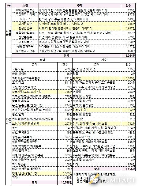 분야별로 살펴보면, 자유공모 정책분야에 가장 많은 10,765건(39.6%)이 접수됐으며, 지정공모 9,264건(34.1%), 자유공모 기술분야 7,156건(26.3%) 순으로 집계됐다.