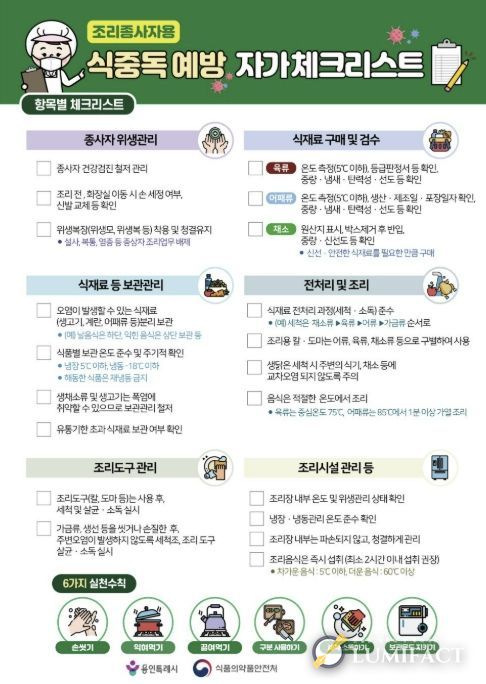 또 조리 종사자들을 대상으로 개인 위생 관리 수칙을 준수하고, 급식·배식 단계별 위생관리 요령, 대량 조리 시 주의 사항 등을 반드시 지켜달라고 했다.