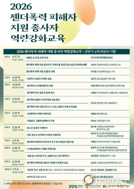 루미팩트 백라희 기자 | 경기도와 경기도젠더폭력통합대응단이 17일 도내 젠더폭력 피해 지원 현장 종사자들의 전문성 향상을 위한 ‘2026 역량강화 교육’ 상반기 과정을 시작하며 현장 대응력 강화에 나섰다.