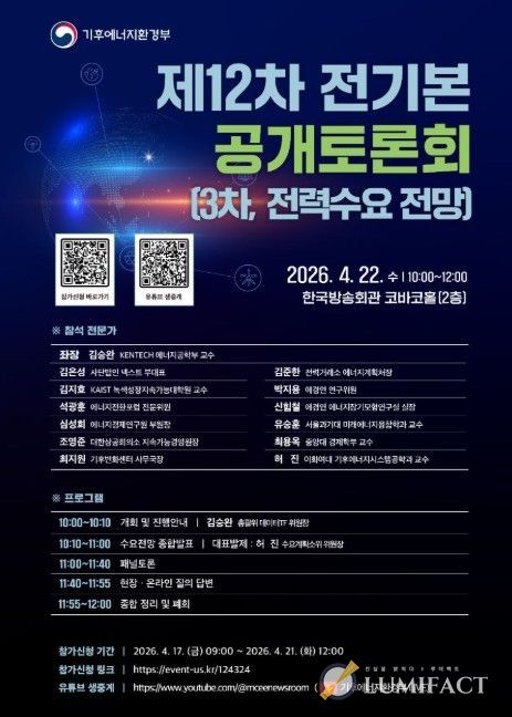 기후에너지환경부와 12차 전기본 수립 총괄위원회는 4월 22일 10시부터 서울 양천구 소재 한국방송회관 코바코홀(2층)에서 3차 대국민 정책토론회를 개최한다고 밝혔다.