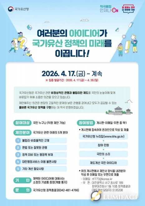 루미팩트 백라희 기자 | 국가유산청은 국가유산 관련 비정상적인 관행과 불합리한 제도를 바로잡기 위한 정상화 과제를 발굴하고자 17일부터 국민들의 참신한 아이디어를 받는다.