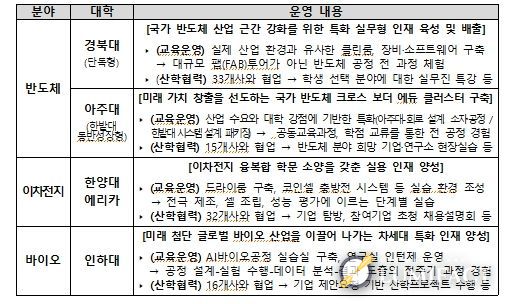 2025년 첨단산업 특성화대학 28개 사업단(38개교)에서는 총 693개의 기업과 함께 총 434건의 교과목(기업 협업 교과목 232건)을 개발·개선하는 등 산업계 친화형 교육과정을 운영하여, 총 3,576명의 인재를 양성했다. 또한, 반도체 팹(FAB) 등 기반 시설을 구축하고 실험·실습 장비를 도입하여 현장 중심 교육 환경을 조성하는 한편, 공동·복수학위 제도 운영 및 교원업적 평가 규정 개선 등 제도 개선을 통해 특성화 분야 교육을 활성화했다.