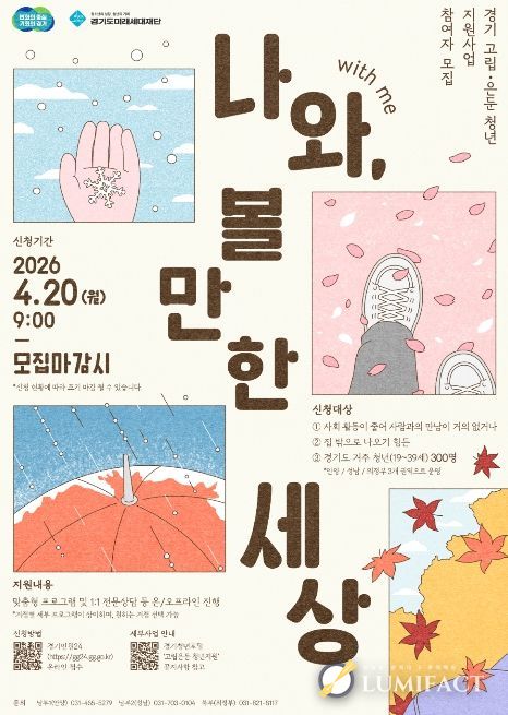 루미팩트 백라희 기자 | 경기도가 사회적 관계가 단절된 고립·은둔 청년의 일상 회복을 돕기 위해 20일부터 ‘경기 고립·은둔 청년 지원사업: 나와(with me), 볼만한 세상’ 참여자 300명을 모집한다.