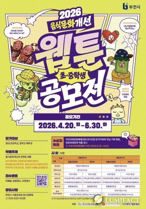 루미팩트 이아린 기자 | 부천시는 4월 20일부터 6월 30일까지 ‘2026년 음식문화개선 초중학생 웹툰·캐릭터 공모전’을 연다. 이번 공모전은 학생들이 일상 속 음식문화를 주제로 직접 창작에 참여함으로써 올바른 식문화에 대한 인식을 높이기 위해 매년 추진되고 있다.