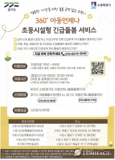 ‘초등시설형 긴급돌봄 서비스’는 갑자기 아동 돌봄이 필요할 때 요긴하다. 예상하지 못했던 출장이나 야근으로 퇴근이 예정보다 늦어지는 경우와 같은 돌발 상황에 모두 이용할 수 있다. 주말이나 휴일, 자정까지의 야간 시간 등은 물론 등교 전인 오전 7시부터 서비스를 제공한다. 장안구 2곳(연무동, 파장동), 권선구 1곳(호매실동), 팔달구 1곳(매교동), 영통구 1곳(매탄동) 등 총 5개 돌봄 기관에서 최대 8시간을 맡아준다. 경기도 아동언제나돌봄 홈페이지에서 온라인 신청할 수 있고, 경기도아동돌봄수원센터에 전화 신청할 수도 있다. 이용요금은 시간당 5천원이다.