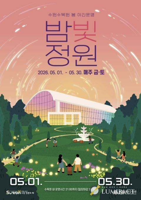 루미팩트 백라희 기자 | 수원특례시가 5월 1일부터 30일까지 매주 금·토요일 일월·영흥수목원에서 ‘2026년 수원수목원 봄 밤빛정원’을 연다.
