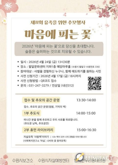 루미팩트 백라희 기자 | 수원시자살예방센터가 24일 오후 1시 30분 팔달문화센터 예당마루홀에서 유족을 위한 추모행사 ‘제11회 마음에 피는 꽃’을 연다.