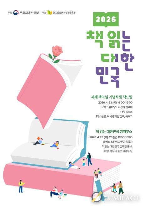 루미팩트 백라희 기자 | 문화체육관광부는 한국출판문화산업진흥원, (재)책읽는사회문화재단과 함께 4월 23일 오후 4시, 서울 코엑스 별마당도서관에서 대국민 독서 캠페인 ‘2026 책 읽는 대한민국’의 시작을 선포하고 캠페인을 본격적으로 추진한다. ‘책 읽는 대한민국’은 인공지능(AI) 시대에 국민의 생각하는 힘을 기르고, 지역 곳곳에 ‘일상 속 책 읽는 즐거움’을 확산하기 위해 마련한 캠페인이다. 최휘영 장관은 캠페인 선포식을 찾아 ‘책 읽는 즐거움’ 확산에 앞장선다.