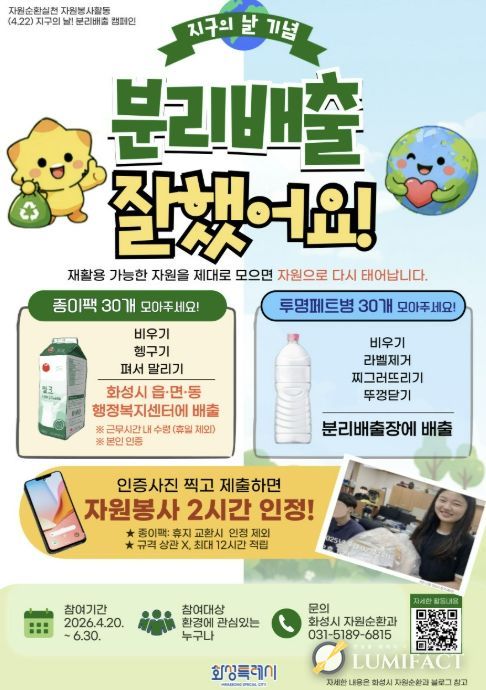루미팩트 백라희 기자 | 화성특례시가 2026년 ‘지구의 날(4월 22일)’을 맞아 시민들이 일상 속에서 환경 보호를 실천할 수 있는 자원봉사 활동 '분리배출 잘했어요' 캠페인을 운영한다고 밝혔다.