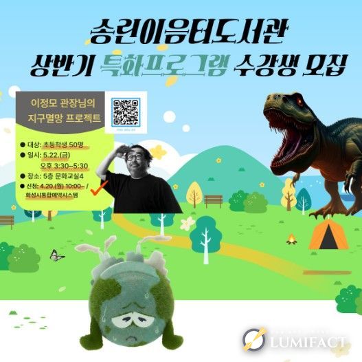 해당 특강 수강생 모집은 4월 20일 10시부터 화성시통합예약시스템(검색어: “지구멸망”)으로 이뤄지며, 대상은 초등학생이며 수강생의 정보로 입력해야 접수할 수 있다.