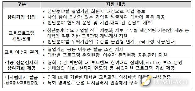 분야별 협업기관은 △참여기업 섭외, △교육프로그램 개발 및 운영, △교육 이수자 관리, △각종 전문 전시회 참여기회 제공 등 사업 운영의 전 단계에서 대학-기업의 교류를 활성화하고, 학생들을 지원하는 역할을 한다. 또한, 대학별 교육과정을 분석하여, 특화 영역별·수준별 디지털 배지 발급을 지원하는 등 인증 체계를 구축하기도 한다.