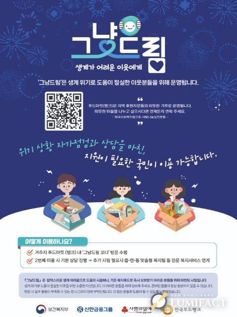그냥드림 사업은 긴급 생계 위기 등으로 어려움을 겪는 국민이 별도의 복잡한 증빙 절차 없이도 식품과 생필품을 신속하게 지원받을 수 있도록 복지 문턱을 낮춘 사회 안전망이다. 물품 지원 이후에는 상담과 복지서비스 연계를 병행하여 복지 사각지대를 해소하고 안정적인 생활기반 마련을 지원하고 있다.