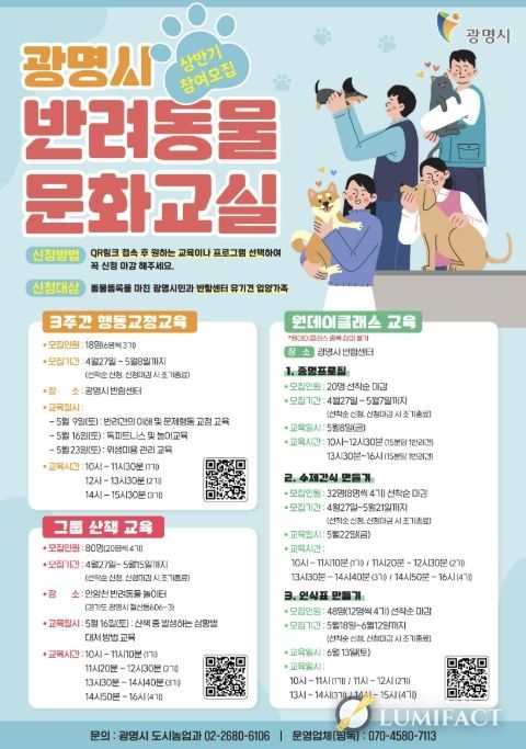 행동교정교육은 5월 9일부터 3주간 광명시 반함센터에서 진행하며, 반려견 이해와 문제행동 교정, 놀이, 위생관리 등을 단계별로 배울 수 있다.