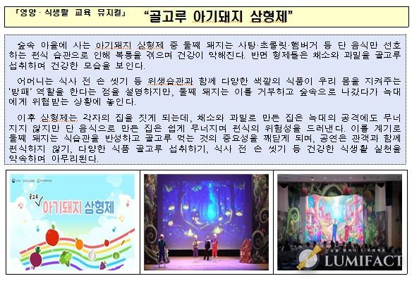 참고로 교육부는 현장소통단의 의견을 수렴하여, 2024년부터 유아의 눈높이에 맞춘 교육용 뮤지컬을 개발해 찾아가는 공연 사업을 추진하고 있다. 올해도 식문화 이해와 긍정적인 식습관 형성을 주제로 하는 새로운 뮤지컬을 개발하여 현장 교육을 지원할 계획이다.
