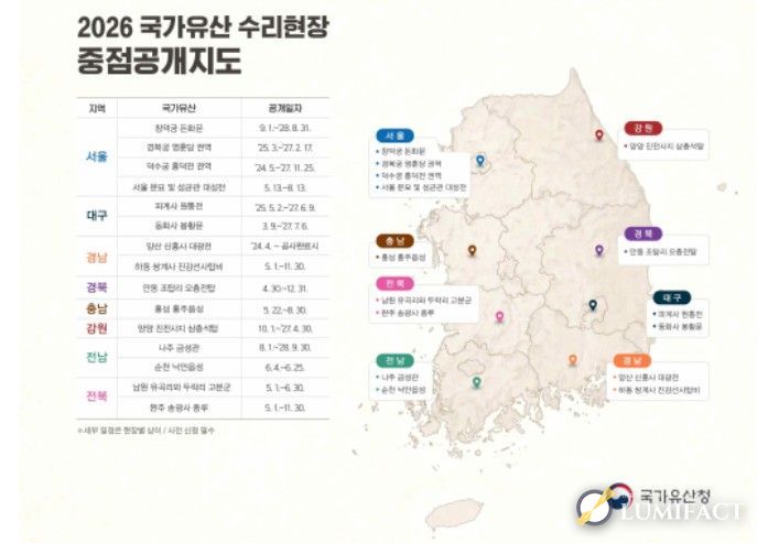 루미팩트 백라희 기자 | 국가유산청은 국가유산 수리과정에 대한 국민의 이해를 높이고, 현장 체험 기회를 확대하기 위해 2026년 전국 주요 국가유산 수리현장 15개소를 선정하여 올해 12월까지 일반에 공개한다.