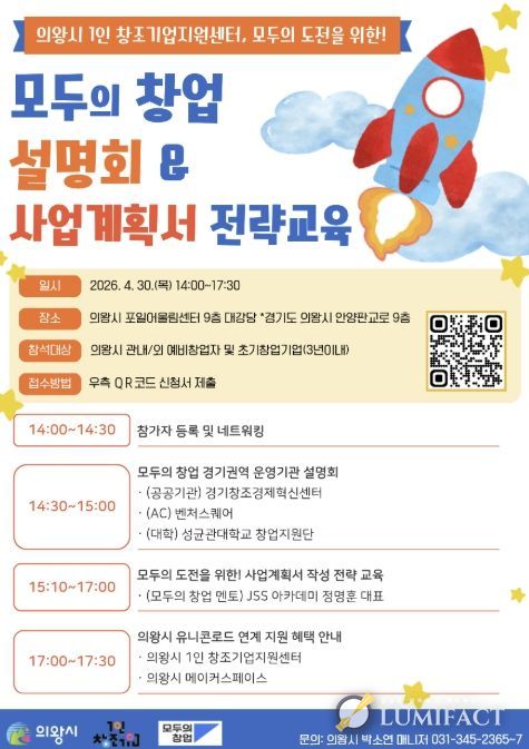 루미팩트 이아린 기자 | 의왕시 1인 창조기업지원센터는 4월 30일, 창업을 희망하는 예비 및 초기 창업자를 대상으로 ‘모두의 창업’ 설명회 및 전략 교육을 개최한다.