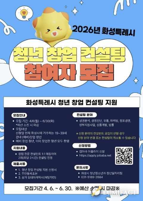 루미팩트 백라희 기자 | 화성특례시는 오는 6월 30일까지 ‘2026년 청년 창업 컨설팅 지원사업’ 참여자를 모집한다.