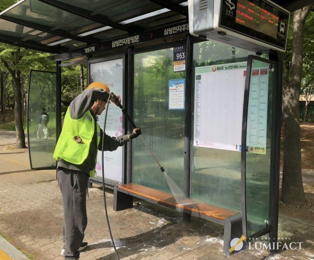 고압 물세척기를 활용해 버스승강장 구조물인 유리벽, 의자, 기둥 등에 쌓인 먼지와 오염물질을 집중 제거하고, 불법광고물과 각종 스티커를 정비하는 등 전반적인 환경 개선 작업을 병행하고 있다.