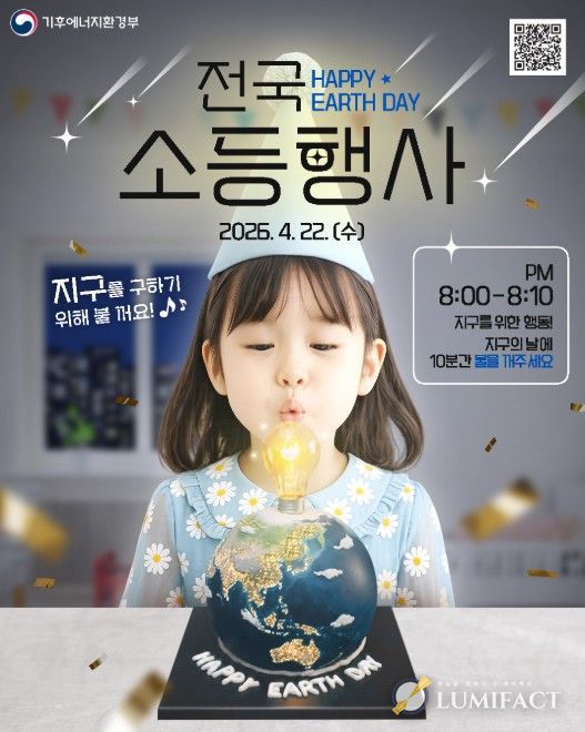 루미팩트 백라희 기자 | 기후에너지환경부는 제56회 지구의 날(매년 4월 22일)을 기념하여 4월 22일 오후 8시부터 10분간 실내외 조명을 끄는 소등행사를 전국에서 동시에 진행한다고 밝혔다.