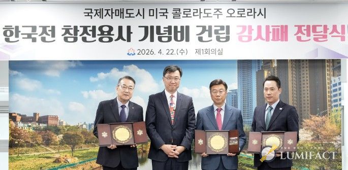 루미팩트 백라희 기자 | 성남시가 22일 오후 2시 미국 콜로라도주 오로라시의 ‘한국전 참전용사 기념비’ 건립에 기여한 공로를 인정받아 오로라시 한국전참전용사기념비건립위원회로부터 감사패를 받았다.