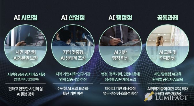 ‘시민 모두의 인공지능 기본권 실현’, ‘인공지능 산업생태계 조성’, ‘인공지능 기반 행정 혁신’을 3대 목표로 설정하고, ▲인공지능(AI) 시민청 ▲인공지능(AI) 산업청 ▲인공지능(AI) 행정청 ▲인공지능 교육·인재 양성으로 분야를 나눠 인공지능 기반 사업을 추진한다.