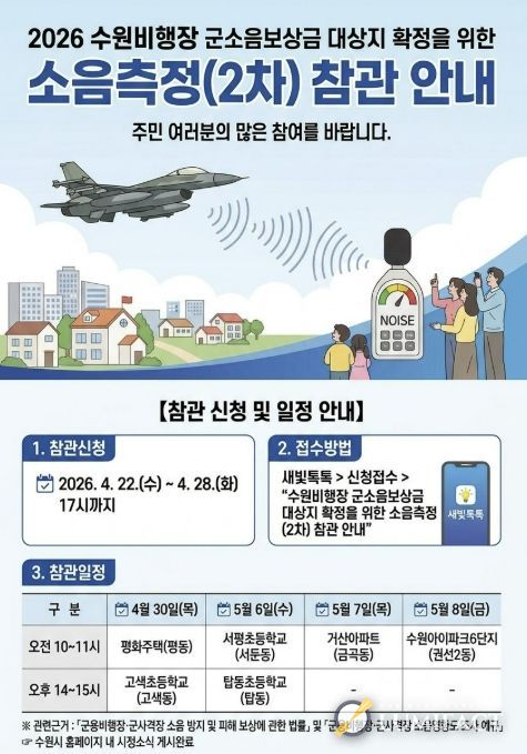 수원시 관계자는 “소음 영향도 조사는 주민 보상과 직결되는 중요한 절차인 만큼 시민 참여로 신뢰도를 높일 것”이라며 “관심 있는 시민들이 적극적으로 참여해 주길 바란다”고 말했다.