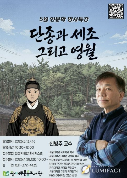 루미팩트 백라희 기자 | 화성시문화관광재단 운영하는 왕배푸른숲도서관이 오는 5월 13일, 지역 주민들을 위해 역사학자 신병주 교수를 초청하여 5월 인문학 명사특강을 개최한다.