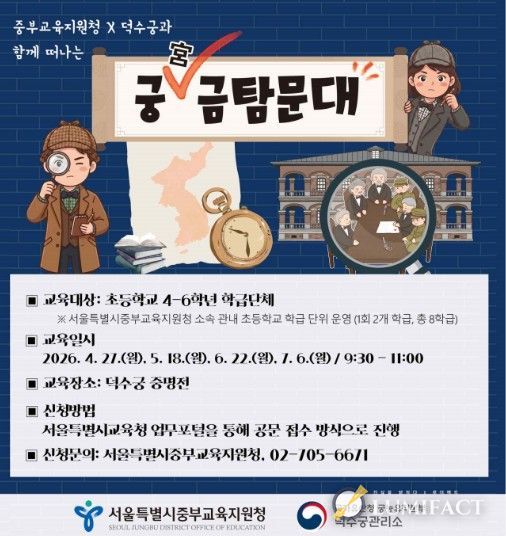 루미팩트 백라희 기자 | 국가유산청 궁능유적본부 덕수궁관리소는 서울특별시중부교육지원청과 함께 4월 27일부터 7월 6일까지 총 4회에 걸쳐 덕수궁 중명전(서울 중구)에서 초등학교 학급단체를 대상으로 현장체험형 국가유산 연계 교육프로그램 '궁(宮)금탐문대'를 운영한다.
