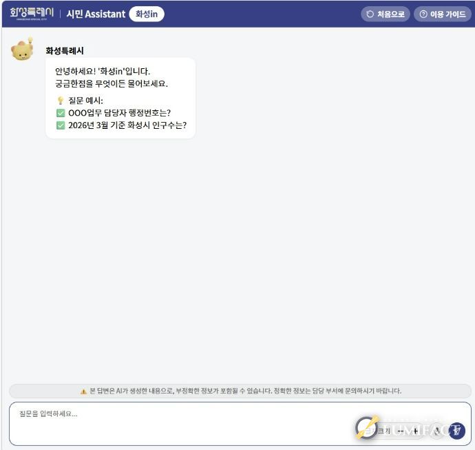 시는 기존 블로그, 조례, 주요 8개 민원 분야 정보를 중심으로 시범 운영해 오던 ‘화성in’에 생성형 AI 기능을 도입하고, 정보 제공 범위를 확대해 서비스를 고도화했다.