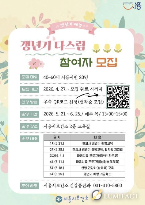 루미팩트 백라희 기자 | 시흥시보건소는 올해부터 한의약 건강증진사업을 시범으로 운영하고, 40~60대 시흥시민을 대상으로 갱년기 신체ㆍ정신 건강관리를 지원하는 한의약 건강증진 프로그램 ‘갱년기 다스림’ 참여자를 모집한다.