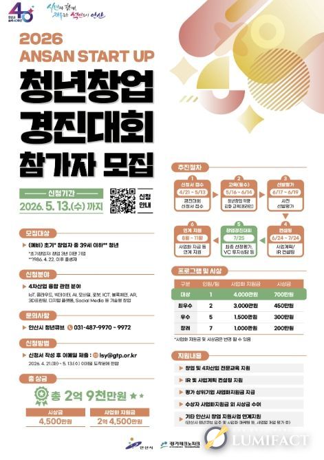 루미팩트 이아린 기자 | 안산시는 창의적인 아이디어를 보유한 청년 창업가를 발굴하기 위해 내달 13일까지 ‘2026 안산 스타트업 청년창업 경진대회’ 참가자를 모집한다고 24일 밝혔다.