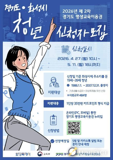 루미팩트 백라희 기자 | 화성특례시는 청년층의 자기계발과 역량 강화를 지원하기 위해 ‘2026년 평생교육이용권 지원사업’ 지역특화(청년) 분야 2차 이용자를 모집한다고 밝혔다.