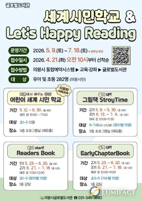 루미팩트 이아린 기자 | 의왕시 글로벌도서관이 책을 통해 세상을 이해하고 체험하는 다문화 이해 프로그램 '어린이 세계 시민 학교'와 영어 읽기 문해력 향상을 위한 단계별 맞춤 프로그램 'Let’s Happy Reading'의 참여자를 모집한다.