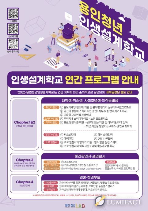 시 관계자는 “용인청년 인생설계학교는 청년의 특정 시기에 국한되지 않고 삶의 전반을 설계해 나가는 생애주기형 프로그램”이라며 “현재 다양한 단계의 교육이 운영되고 있는 만큼, 청년들이 각자의 단계에 맞는 과정을 통해 성장할 수 있도록 맞춤형 지원을 확대하겠다”고 했다.