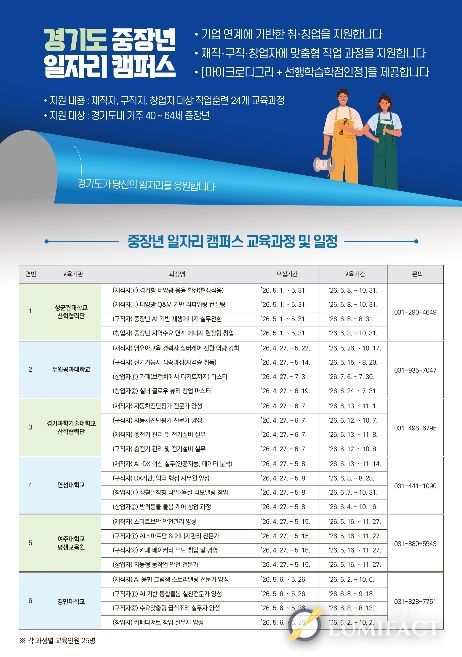 루미팩트 백라희 기자 | 경기도가 중장년층의 재취업과 창업을 지원하기 위한 실무형 직업훈련 ‘중장년 일자리캠퍼스’를 올해 처음 추진하며 직업훈련 24개 과정별 25명씩 총 600명의 교육생을 모집한다.