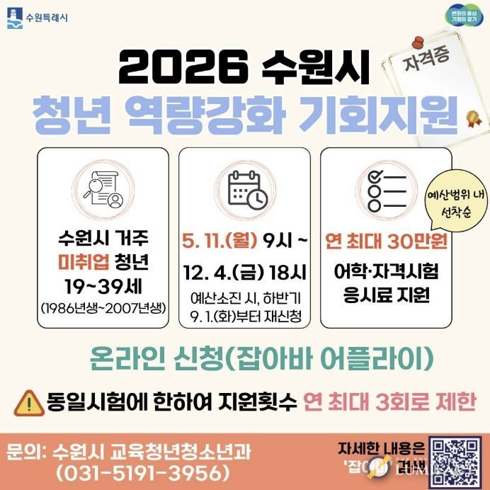 루미팩트 백라희 기자 | 수원특례시는 미취업 청년의 취업 준비 비용 부담을 덜어주는 ‘청년 역량강화 기회 지원 사업’을 12월 4일까지 운영한다. 미취업 청년에게 어학·자격시험 응시료를 1인당 연 최대 30만 원 지원한다.
