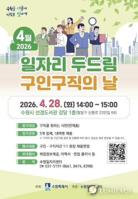 루미팩트 백라희 기자 | 수원특례시는 4월 28일 오후 2시부터 3시까지 선경도서관 강당에서 ‘4월 일자리 두드림 구인·구직의 날’을 개최한다.