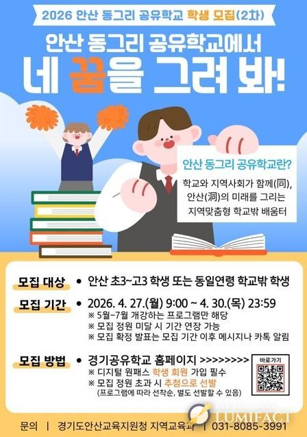 루미팩트 이아린 기자 | 안산시 중앙도서관은 내달부터 안산교육지원청이 추진하는 ‘2026년 안산 동그리 우리동네 도서관 공유학교’ 사업에 참여해 지역 교육 인프라 확충에 나선다고 27일 밝혔다.