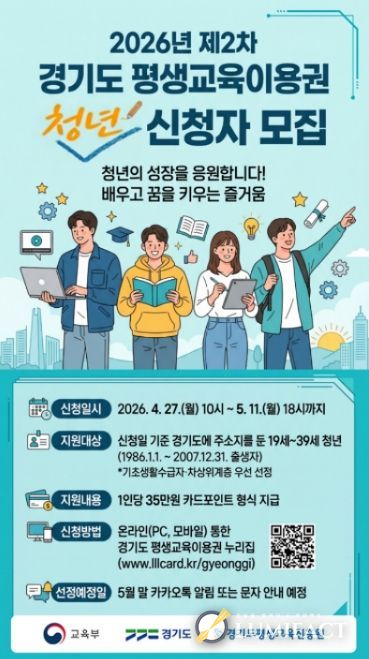 이번 사업은 경제적 여건과 관계없이 학습 참여를 지원하는 평생교육 이용권으로, 신청대상자는 경기도에 주민등록상 주소를 둔 19~39세 청년이며, 선정 시 1인당 35만 원의 교육비(수강료 및 교재비)를 지원받는다.