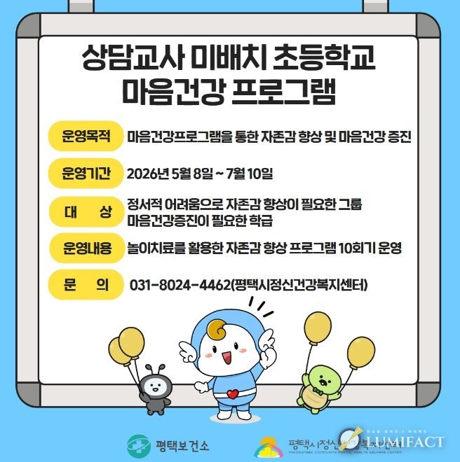 루미팩트 이아린 기자 | 평택시는 상담교사가 배치되지 않은 초등학교 학생들의 정신건강 지원을 위해 ‘마음건강 프로그램’을 운영한다고 밝혔다.