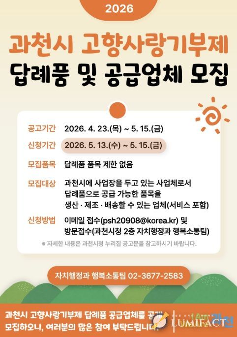 루미팩트 백라희 기자 | 과천시는 고향사랑기부제 활성화를 위해 답례품 공급업체를 공개 모집한다고 밝혔다.