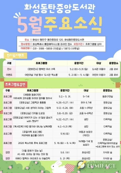 루미팩트 백라희 기자 | 화성동탄중앙도서관이 어린이날과 가정의 달을 맞아 5월 한 달간 도서관 이용자와 시민을 대상으로 자료실과 3층 공공의 마당 등에서 다양한 문화행사를 운영한다.