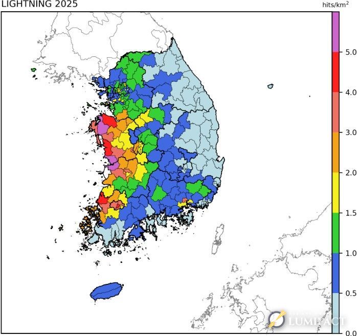 루미팩트 백라희 기자 | 기상청은 2025년 우리나라에서 관측된 낙뢰 정보를 담은 ‘2025 낙뢰연보’를 발간했다. 연보는 기상청 21개 낙뢰 관측망으로 관측한 자료를 통해 분석한 △월별, 광역시·도별, 시군구별 낙뢰 횟수 △단위 면적당(㎢) 횟수 △낙뢰 공간 분포 △주요 5대 낙뢰 사례 등의 내용을 담고 있다.
