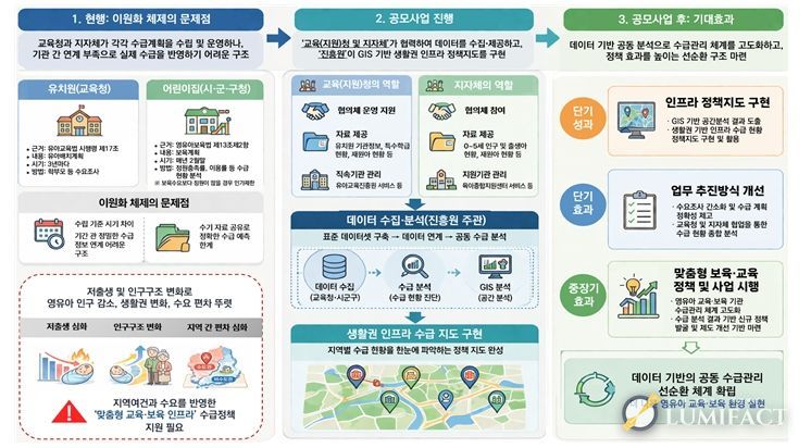 특히, 저출산으로 인한 지역 소멸 위기 확대에 따라 교육·보육 기반 시설(인프라)의 지역 간 격차는 심해지고 있으나, 유치원과 어린이집에 대해 교육청과 지자체가 각각 관리하고 있어 관련 정보의 연계 및 실질적 수요 반영이 미흡한 상황이다.