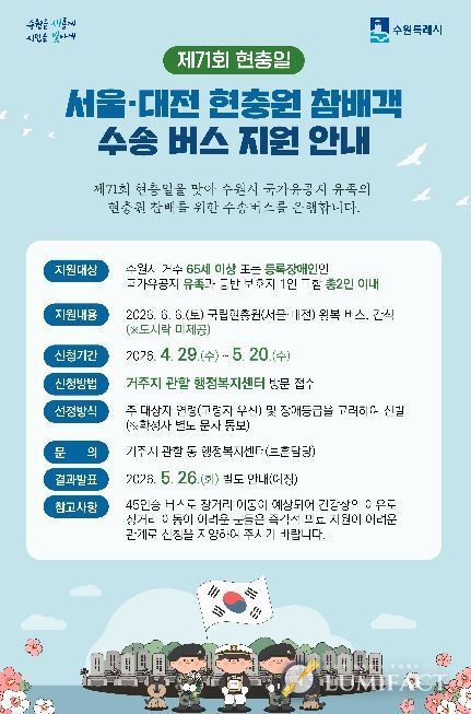 루미팩트 백라희 기자 | 수원특례시가 제71회 현충일인 6월 6일, 국립현충원(서울·대전)까지 이동이 여의치 않은 국가유공자 유족을 위해 현충원 왕복 수송버스를 운행한다.