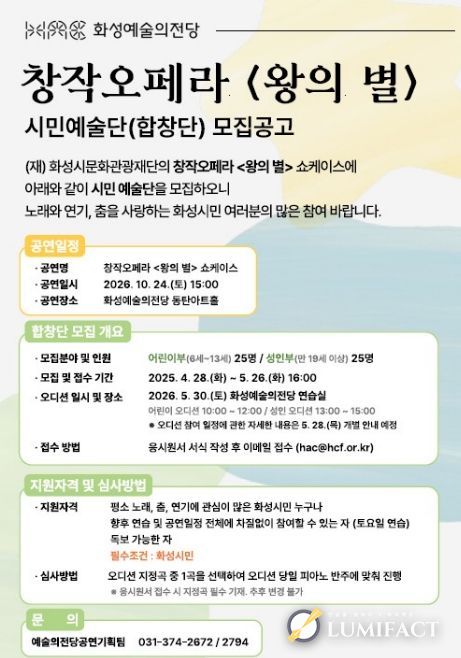 루미팩트 백라희 기자 | (재)화성시문화관광재단은 오는 10월 개최 예정인 창작오페라 '왕의 별' 쇼케이스 무대에 참여할 시민합창단을 모집한다.