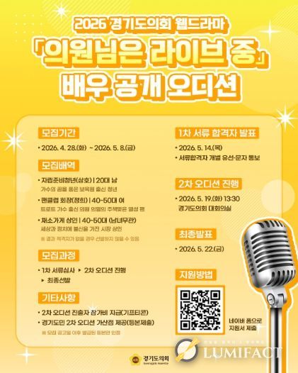 루미팩트 백라희 기자 | 경기도의회는 2026년도 경기도의회 웹드라마 ‘의원님은 라이브 중(가제)’에 출연할 배우를 공개 모집하기 위해 오디션을 개최한다.