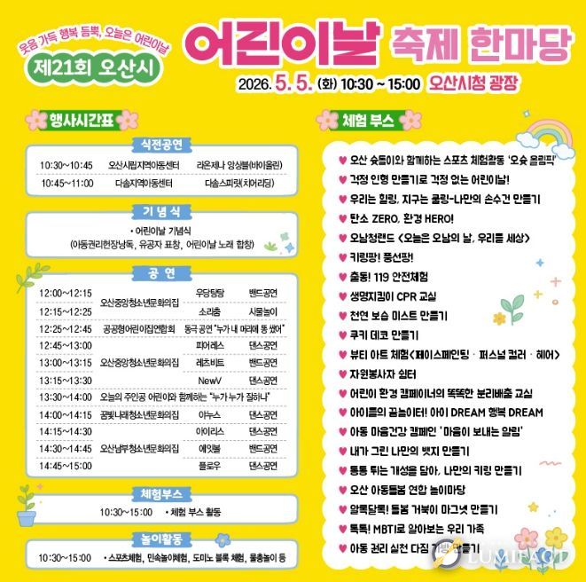 행사장에서는 오산시립지역아동센터 라온제나 앙상블과 다솜지역아동센터 다솜스피릿의 식전 공연을 시작으로 어린이날 기념식이 열린다. 이어 아동권리다짐 가방 만들기, 키링 만들기, 쿠키 만들기 등 다양한 체험부스가 운영된다.