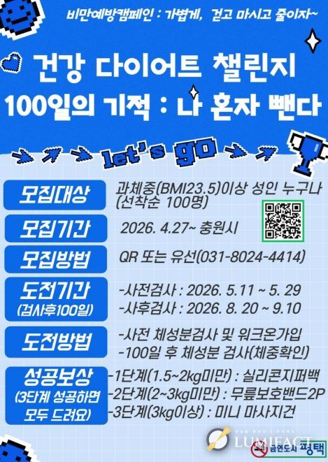 루미팩트 이아린 기자 | 평택시는 시민들이 스스로 비만 관리 능력을 키우고 건강한 생활 습관을 정착시킬 수 있도록 돕는 비만 예방 프로그램 '100일의 기적’참가자를 모집한다고 밝혔다.
